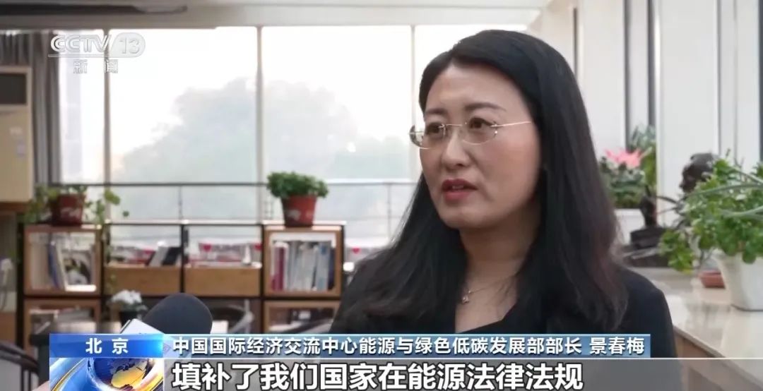 中国国际经济交流中心能源与绿色低碳发展部部长景春梅:《能源法》的颁布填补了我们国家在能源法律法规顶层设计上面的空白。现在,我们等于有一个完整的能源法律法规的体系了,而且我们有一个能源发展的根本大法了。
